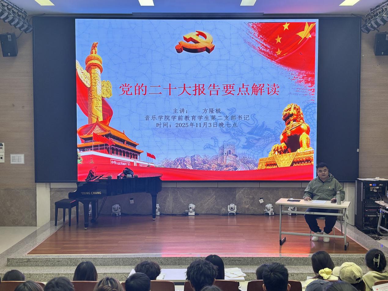 2025年11月3日19:00,音乐学院第54期入党积极分子第二次党课培训《党的二十大报告要点解读》在音乐楼403教室举行。本次培训由学前教育学生第二支部书记方隆极老师主讲,旨在深化积极分子对党的二十大精神的理解。
