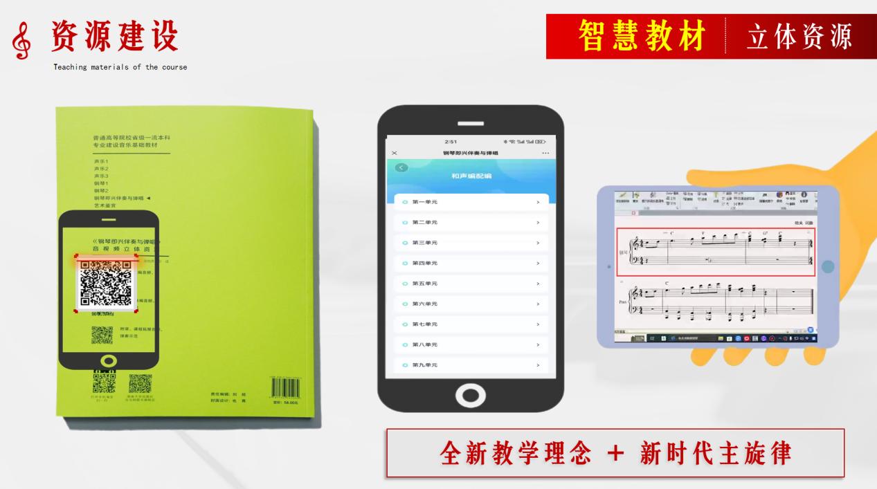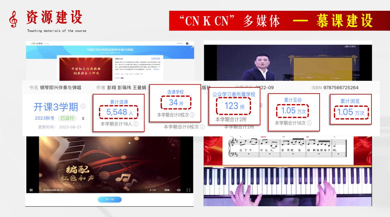 钢琴即兴伴奏作为我院省级一流专业音乐学重点建设课程,于2022年9月在湖南大学出版社出版教材《钢琴即兴伴奏与弹唱》,线上课程《中国红色经典歌曲钢琴伴奏与弹唱》获批校级一流课程,《钢琴即兴伴奏》获批课程思政校级示范课程。