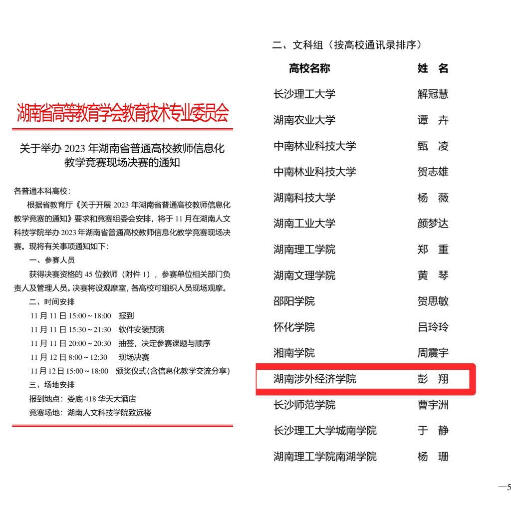 由湖南省教育厅举办的2023年湖南省普通高校教师信息化教学竞赛旨在大力推行教育数字化战略,推动高校指挥教育快速发展,引导广大教师主动适应人工智能与大数据等技术变革,深化信息化教学改革,提高课程育人能力,提升教育教学信息化建设水平。我院教师彭翔作为文科组选手,以参赛作品《“以屏传佳音”三视角融合下钢琴即兴伴奏信息化教学改革与实践》脱颖而出,在全省52所高校选出的160余名参赛选手中,进入前30%,代表学校入围,省级决赛。