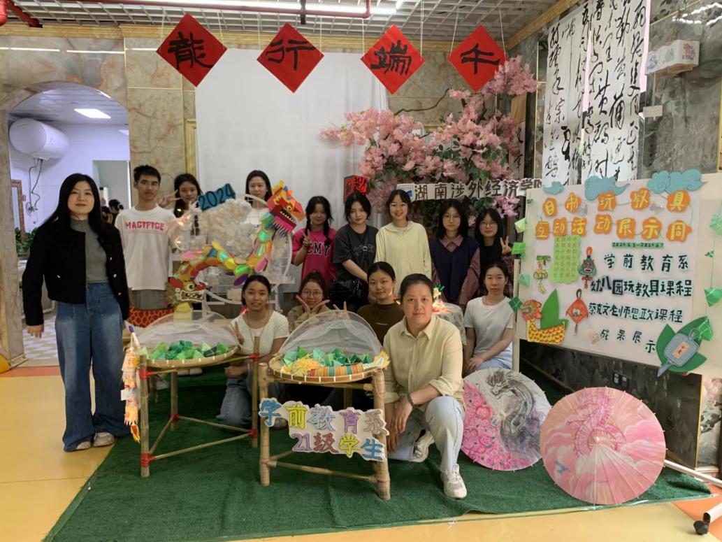 在音乐学院一楼音乐大厅,分不同区域展示着幼儿园玩教具课程的教学内容主题,包括个人作品展示如龙纹再造玩教具作品、方言童谣玩教具,也有实现幼儿园一日活动、体现夏季节气及融入湖湘文化的系列玩教具的小组作品展示。学生的众多作品形态新颖、色彩丰富、材料独特、手工精巧,结合专业需求和实用技术,从多元化视角展现着新时代大学生的专业素养和思政风采,受到了现场师生的充分肯定。