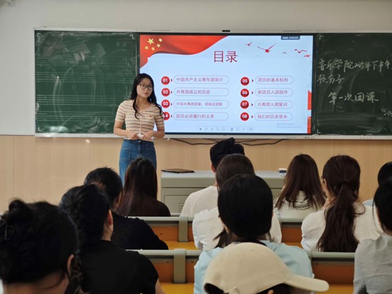 2025年10月10日中午,湖南涉外经济学院音乐学院第一次团课在音乐楼303教室如期举行。2025年下半年入团积极分子齐聚一堂,共同开启了以“中国共青团的发展历程”为主题的思想学习之旅。