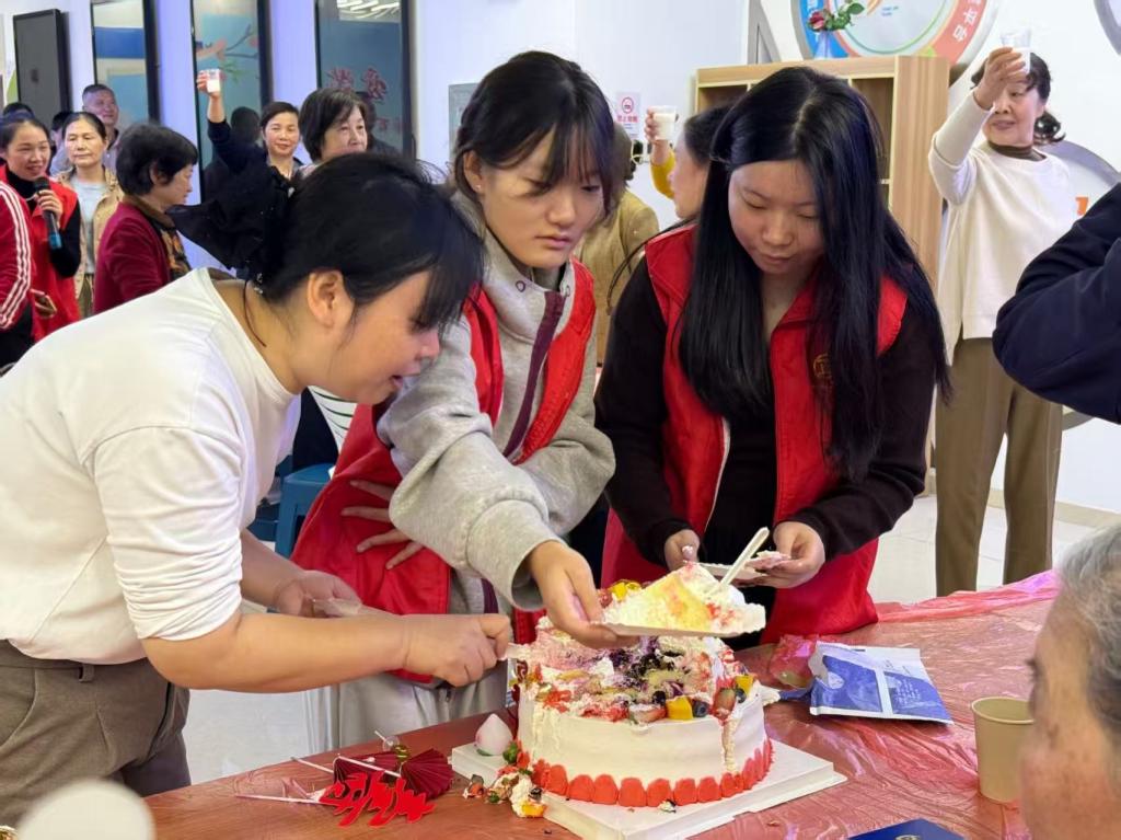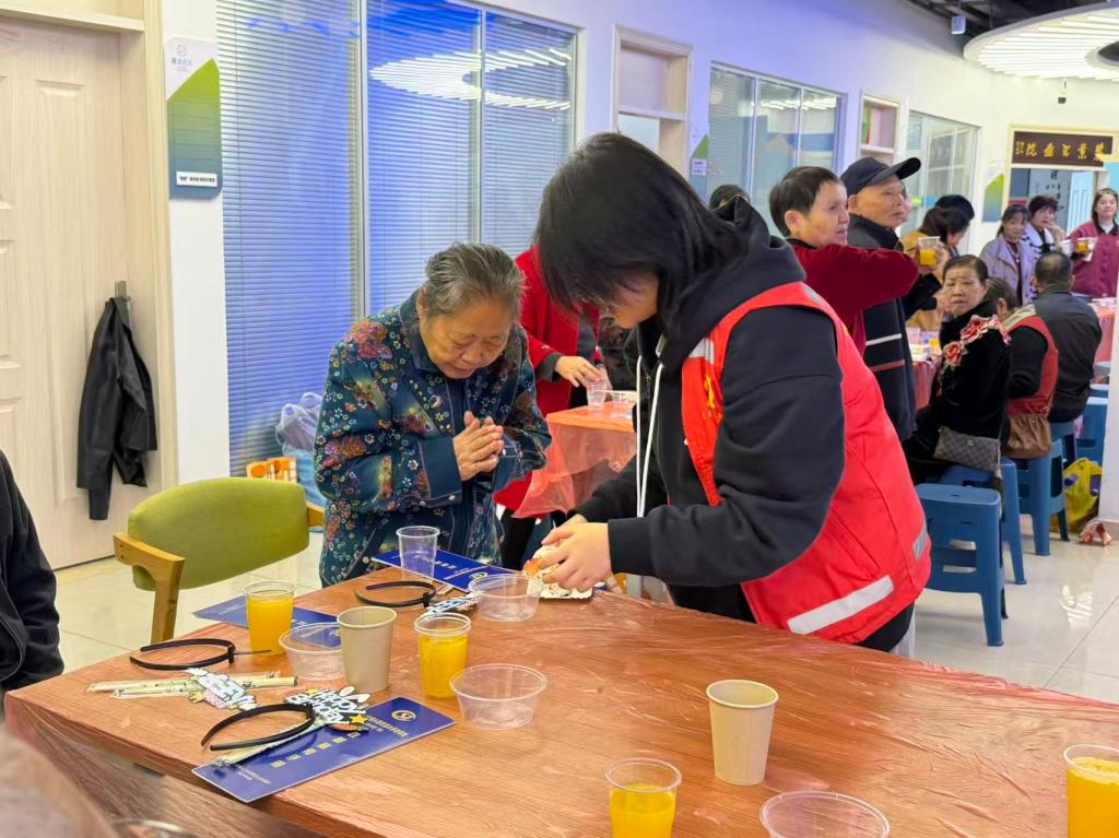 2楼的活动同样暖人心脾。手工区里,两位沐爱而行志愿者全程陪伴,手把手配合老人们完成手工创作,让指尖流转着温情;百家宴区更是烟火气十足,四位沐爱而行志愿者穿梭其间,细心配合上菜,让老人们在品尝美味的同时,感受到如同家人团聚般的温暖。