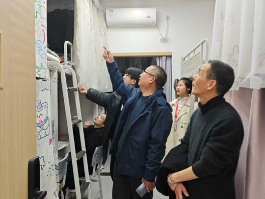 周孝贵书记一行在视察中,重点检查了宿舍消防设施、用电规范及环境卫生,细致排查大功率电器使用、私拉电线等安全隐患。他详细询问学生日常用电习惯,针对安全意识薄弱的情况,现场强调“人走断电”等要求。同时,对宿舍卫生进行了检查,表扬了整洁有序的优秀宿舍,并对存在不足的提出了整改建议。